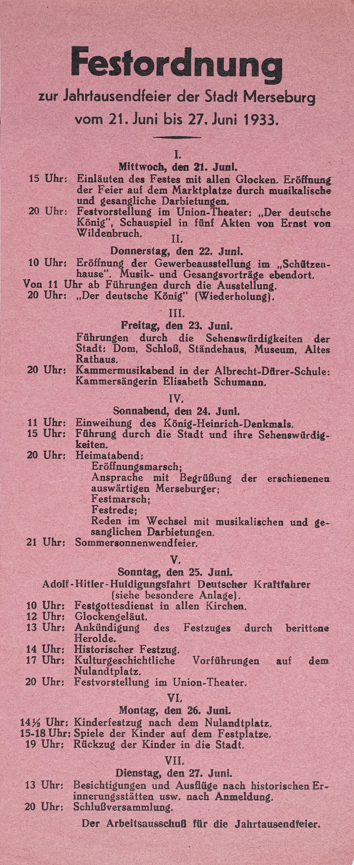 Aktuell Merseburg 1933 – Festordnung zur Jahrtausendfeier der Stadt Merseburg vom 21. Juni bis 27. Juni 1933 27. Dezember 2025 Dr. Hans-Jörg Zöllner Heimatliteratur, Merseburg