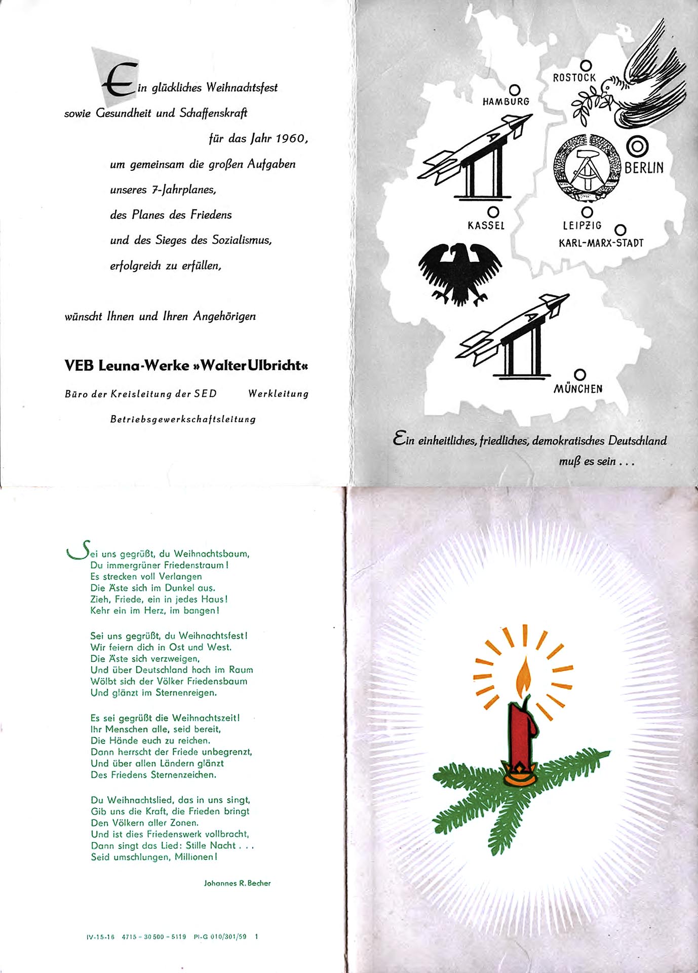Weihnachtskarte der VEB Leuna-Werke Walter Ulbricht zu Weihnachten 1959 an die Mitarbeiter, verbunden mit Wünschen für ein erfolgreiches Jahr 1960.