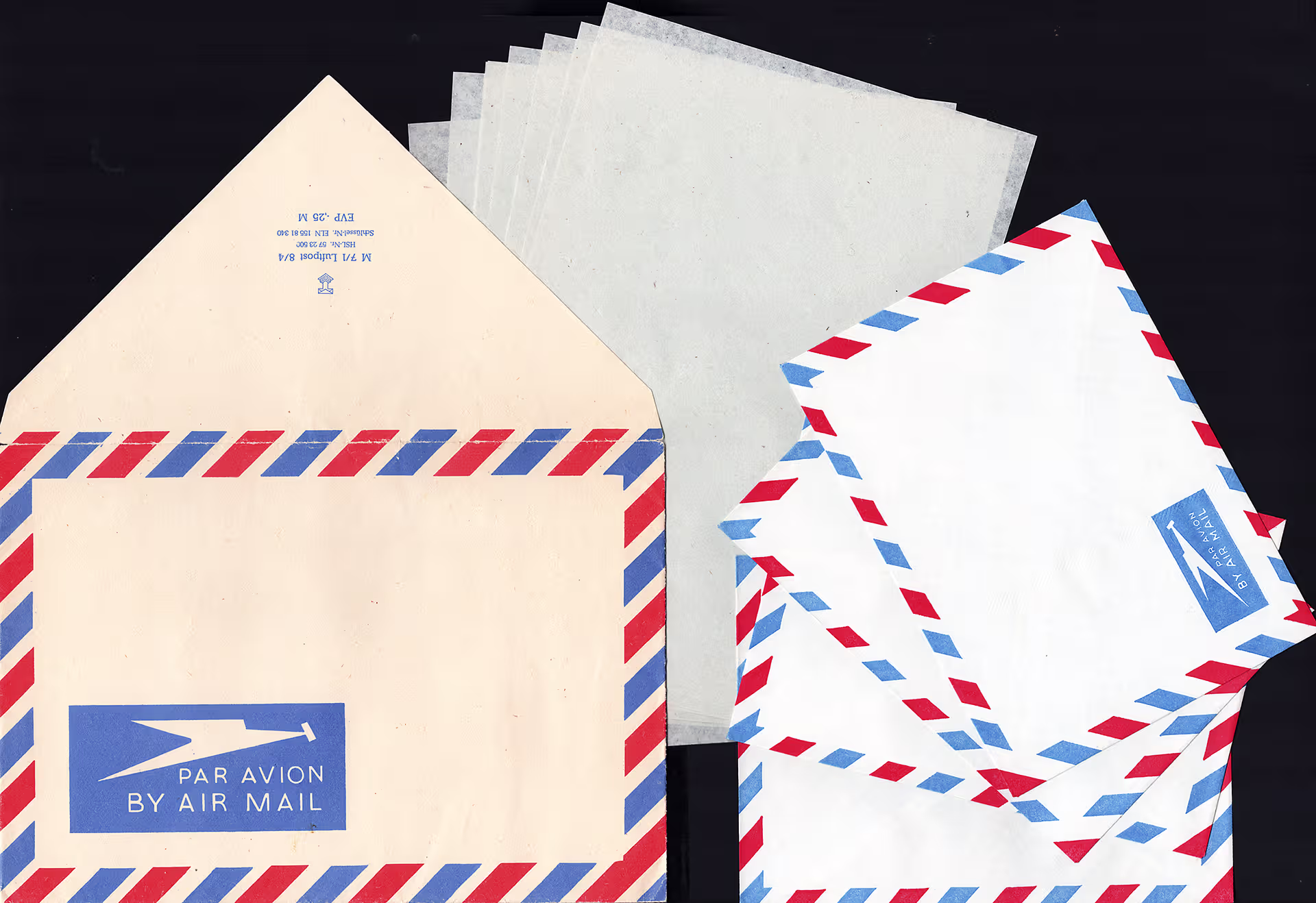 Zur Gewichtsreduzierung von internationalen Postsendungen gab es in der DDR ein Luftpost – Set aus Pergament – Papier und leichten, verschieden großen Umschlägen