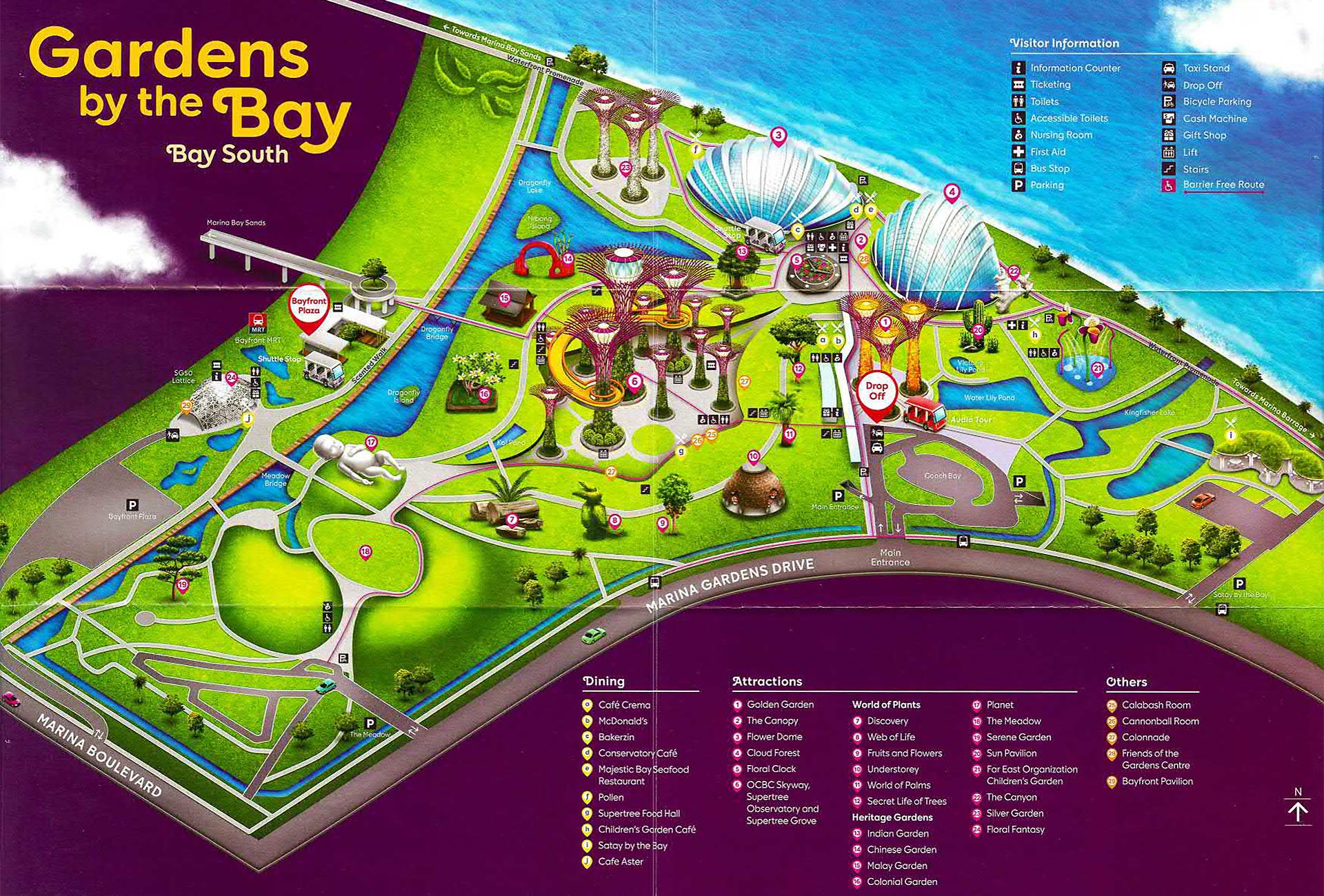 Die “Gardens by the Bay” sind auf künstlich aufgeschüttetem Land angelegt worden. Sie sind ca. 100 Hektar groß. Das Parkgelände verläuft direkt entlang des Meeres am Marina Reservoir. Die “Gardens by the Bay” sind aufgrund ihrer Größe in mehrere Gärten unterteilt, die mit einem Kombi – Tickes besucht werden können, welches auch einen Transfer auf dem Gelände enthält. Hier gibt es Bilder vom Flower Dome der mit seiner Größe von 1,28 Hektar das größte der Gewächshäuser ist. In ihm herrscht ein mildes, trockenes Klima für mediterrane Pflanzen wie Olivenbäume, Kanarische Dattelpalmen und Affenbrotbäume aber auch Kakteen und andere Sukkulenten. Der “Flower Dome” hat es als größtes Glasgewächshaus der Welt ins Guinness Buch der Rekorde geschafft.